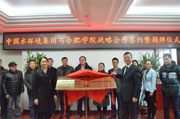 2016年11月30日,中國(guó)水環(huán)境集團(tuán)與合肥學(xué)院在南艷湖校區(qū)舉行校企戰(zhàn)略合作簽約暨揭牌儀式,開(kāi)啟雙方在人才培養(yǎng)和科學(xué)研究等方面的全面戰(zhàn)略合作。中國(guó)水環(huán)境集團(tuán)安徽公司負(fù)責(zé)人陳懷、副總經(jīng)理?xiàng)钚l(wèi)國(guó),合肥學(xué)院副校長(zhǎng)陳秀、科技處處長(zhǎng)吳克及研究生處、教務(wù)處、生物與環(huán)境工程系等部門(mén)和單位領(lǐng)導(dǎo)出席簽約儀式。