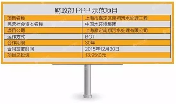 上海嘉定區(qū)通過PPP模式在全國范圍內(nèi)公開招標(biāo)而來的企業(yè)是中國水環(huán)境集團。作為國內(nèi)領(lǐng)先、世界一流的綜合水環(huán)境治理服務(wù)投資運營商,截至2016年9月1日,中國水環(huán)境集團擁有6個財政部PPP示范項目(具體為首批示范項目:貴陽南明河水環(huán)境綜合治理、上海嘉定南翔下沉式污水處理廠。第二批示范項目:廣安潔凈水區(qū)域水環(huán)境治理、成都天府新區(qū)污水處理廠及科學(xué)生態(tài)城、大理洱海環(huán)湖治理、京津冀北運河流域治理)。