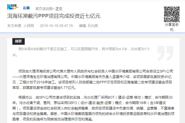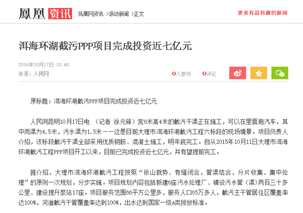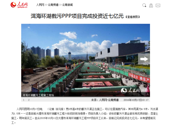洱海環(huán)湖截污PPP項(xiàng)目完成投資近七億元——人民網(wǎng)、新華網(wǎng)、鳳凰網(wǎng)