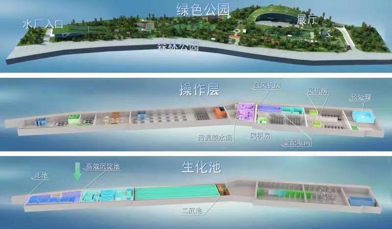 那么這個(gè)矛盾有沒(méi)有解?下沉式再生水廠就提供了新的思路。創(chuàng)新規(guī)劃全封閉下沉式水處理系統(tǒng),創(chuàng)新規(guī)劃污水處理廠,藏身于地面景觀之下。水廠分為三層,地下兩層為操作層和處理池體層,水廠地面土地將可建設(shè)綠化公園、科普館、旅游設(shè)施等,將環(huán)境治理和綠色發(fā)展有機(jī)融合。