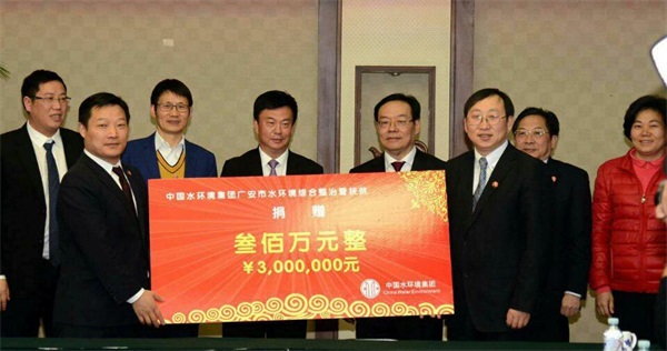 2016年3月11日,中國水環(huán)境集團在北京舉行捐贈儀式,向廣安市政府捐贈人民幣300萬元,用于廣安市扶貧助困及“小平故里”水環(huán)境綜合整治工作。廣安市委書記侯曉春、中信產(chǎn)業(yè)基金總裁田宇、中國水環(huán)境集團董事長侯鋒出席捐贈儀式并講話。
