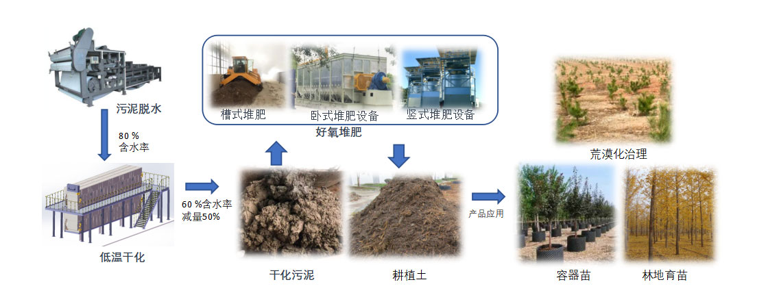 工藝路線: 脫水污泥 --- 低溫干化 --- 好氧堆肥 --- 綠化應(yīng)用